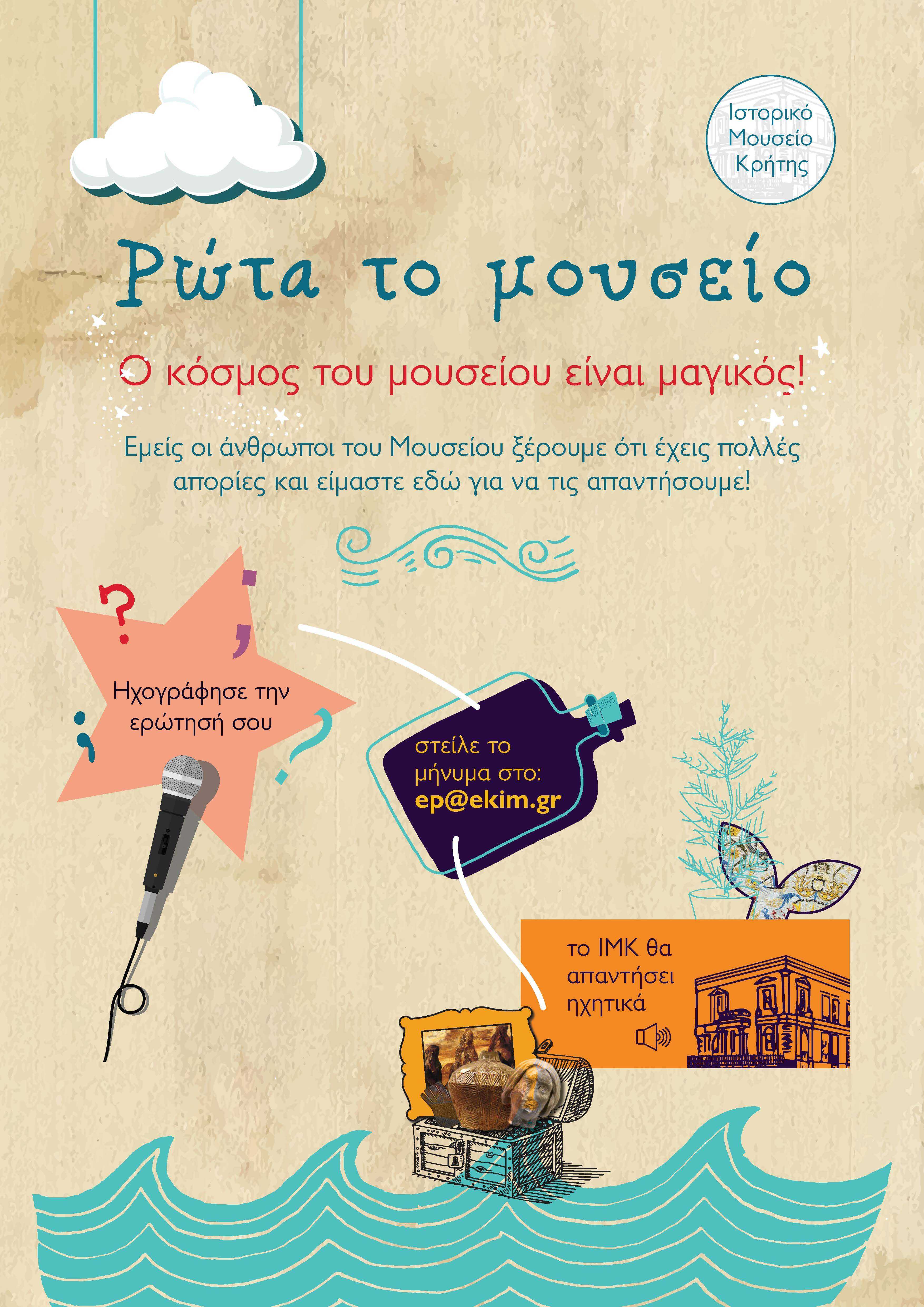 ►Έπειτα εμείς, θα συλλέξουμε όλες τις ερωτήσεις και θα απαντήσουμε επίσης, ηχητικά από το PODCAST του Ιστορικού Μουσείου Κρήτης (εκπομπή Ρώτα το Μουσείο), σε ημέρα και ώρα που θα αναρτηθεί στα μέσα κοινωνικής δικτύωσης του Ιστορικού Μουσείου Κρήτης.