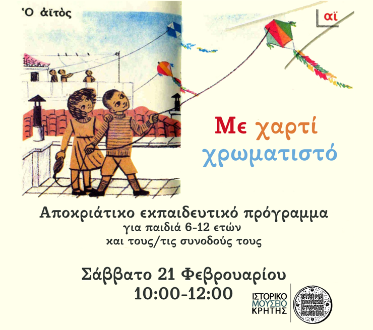 Το Ιστορικό Μουσείο Κρήτης προσκαλεί παιδιά και ενήλικες σε ένα ταξίδι με έναν χαρταετό, το Σάββατο 21 Φεβρουαρίου 2026, 10:00-12:00. Ταξιδεύει κανείς σε ένα μουσείο; Ποια αντικείμενα έφτασαν εδώ από μακρινούς τόπους; Πόσο μακριά ταξίδεψαν άνθρωποι από την Κρήτη; Θα εξερευνήσουμε μαζί με τα παιδιά επιλεγμένα εκθέματα του Ιστορικού Μουσείου Κρήτης, κάνοντας ένα ταξίδι στον χρόνο και στα αρχεία του Μουσείου. Στη συνέχεια θα κατασκευάσουμε έναν χαρταετό για την Καθαρά Δευτέρα!