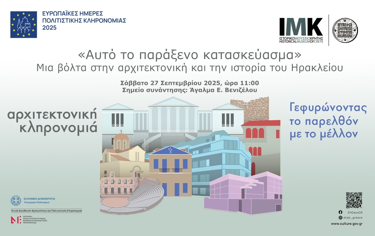 Ο φετινός εορτασμός των Ευρωπαϊκών Ημερών Πολιτιστικής Κληρονομιάς έχει τον γενικό τίτλο «Αρχιτεκτονική Κληρονομιά - Γεφυρώνοντας το παρελθόν με το μέλλον».Το Ιστορικό Μουσείο Κρήτης συμμετέχει στον εορτασμό με έναν εκπαιδευτικό περίπατο στα κτίρια και την ιστορία του Ηρακλείου.