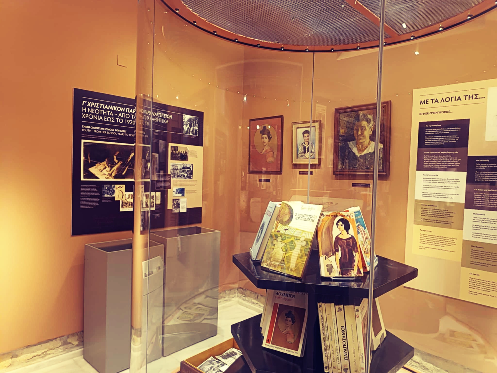 - Στο ισόγειο, όπου παρουσιάζεται η βασική πληροφορία για τη ζωή και το έργο της σε συνδυασμό με φωτογραφικό υλικό, βιβλία, χειρόγραφα και προσωπικά της αντικείμενα.