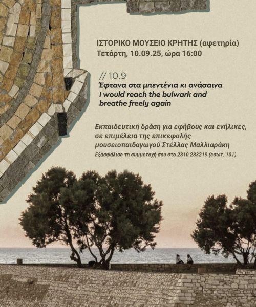 ΞΕΝΑΓΗΣΗ - ΕΚΠΑΙΔΕΥΤΙΚΗ ΔΡΑΣΗ για εφήβους και ενήλικες (Ιστορικό Μουσείο Κρήτης, Τετάρτη 10 Σεπτεμβρίου 2025, ώρα 16:00) | Στέλλα Μαλλιαράκη, «Έφτανα στα μπεντένια κι ανάσαινα». Αφετηρία: Ιστορικό Μουσείο Κρήτης προς τον Προμαχώνα «Παντοκράτορα» (ώρα προσέλευσης στο ΙΜΚ, 15:45)