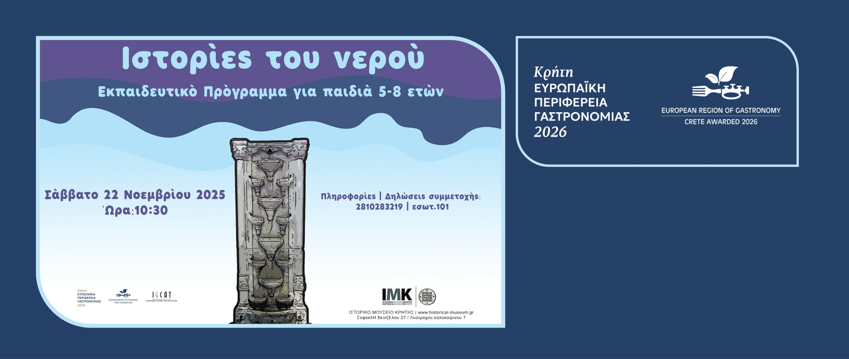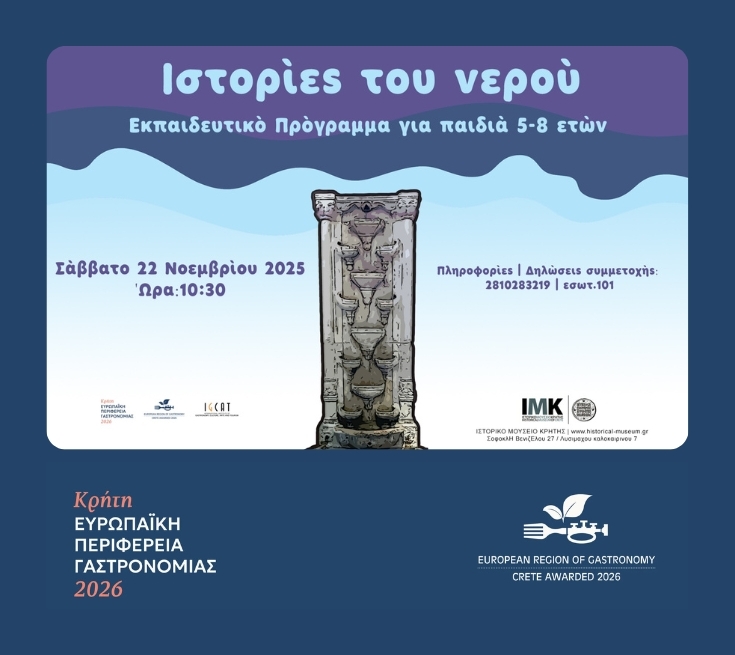 Το Σάββατο 22 Νοεμβρίου 2025 το Τμήμα Εκπαιδευτικών Προγραμμάτων του Ιστορικού Μουσείου Κρήτης προσκαλεί τα παιδιά σε μια βόλτα εξερεύνησης μέσα στο Μουσείο. Από την Κάντια μέχρι το Ηράκλειο θα ακολουθήσουμε τους δρόμους του νερού που θα μας οδηγήσουν στις πηγές και στα λουτρά της πόλης. Μέσα από τον πειραματισμό και το παιχνίδι θα προβληματιστούμε σχετικά με τον τρόπο ύδρευσης του Ηρακλείου και πώς αυτός εξελίχθηκε. Τα παιδιά θα ανακαλύψουν τις προκλήσεις στην υδροδότηση μιας πόλης και θα αποφασίσουν συλλογικά τους κανόνες ορθής χρήσης του νερού.