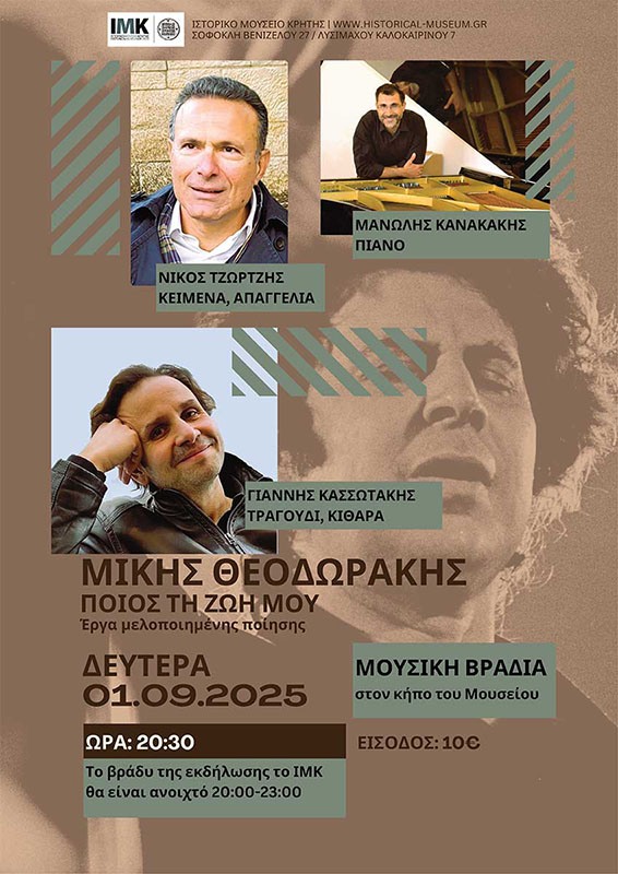 Τη Δευτέρα 1 Σεπτεμβρίου 2025 δίνουμε ραντεβού στον κήπο του Ιστορικού Μουσείου Κρήτης με μια βραδιά ποίησης και μουσικής, αφιερωμένη στον Μίκη Θεοδωράκη. Παραμονή της επετείου θανάτου του συνθέτη, ο Γιάννης Κασσωτάκης, ο Νίκος Τζώρτζης και ο Μανώλης Κανακάκης θα μας ταξιδέψουν, με μία παράσταση μουσικής και λόγου, στο έργο του Μίκη Θεοδωράκη.