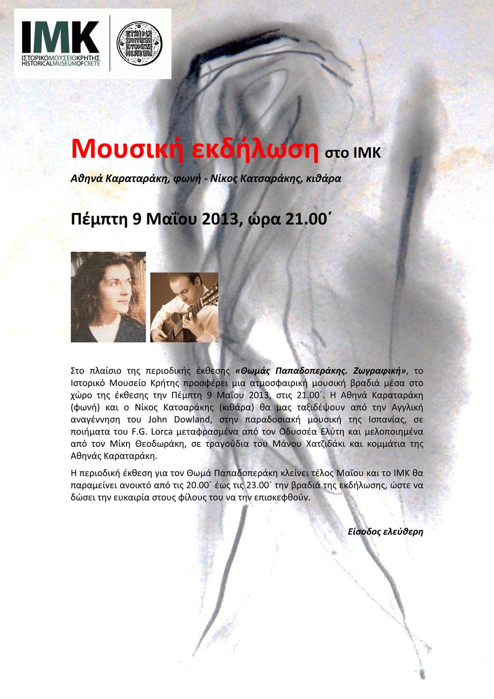 Στο πλαίσιο της περιοδικής έκθεσης «Θωμάς Παπαδοπεράκης. Ζωγραφική», το Ιστορικό Μουσείο Κρήτης προσφέρει μια ατμοσφαιρική μουσική βραδιά μέσα στο χώρο της έκθεσης την Πέμπτη 9 Μαΐου 2013, στις 21.00΄. Η Αθηνά Καραταράκη (φωνή) και ο Νίκος Κατσαράκης (κιθάρα) θα μας ταξιδέψουν από την Αγγλική αναγέννηση του John Dowland, στην παραδοσιακή μουσική της Ισπανίας, σε ποιήματα του F.G. Lorca μεταφρασμένα από τον Οδυσσέα Ελύτη και μελοποιημένα από τον Μίκη Θεοδωράκη, σε τραγούδια του Μάνου Χατζιδάκι και κομμάτια της Αθηνάς Καραταράκη.