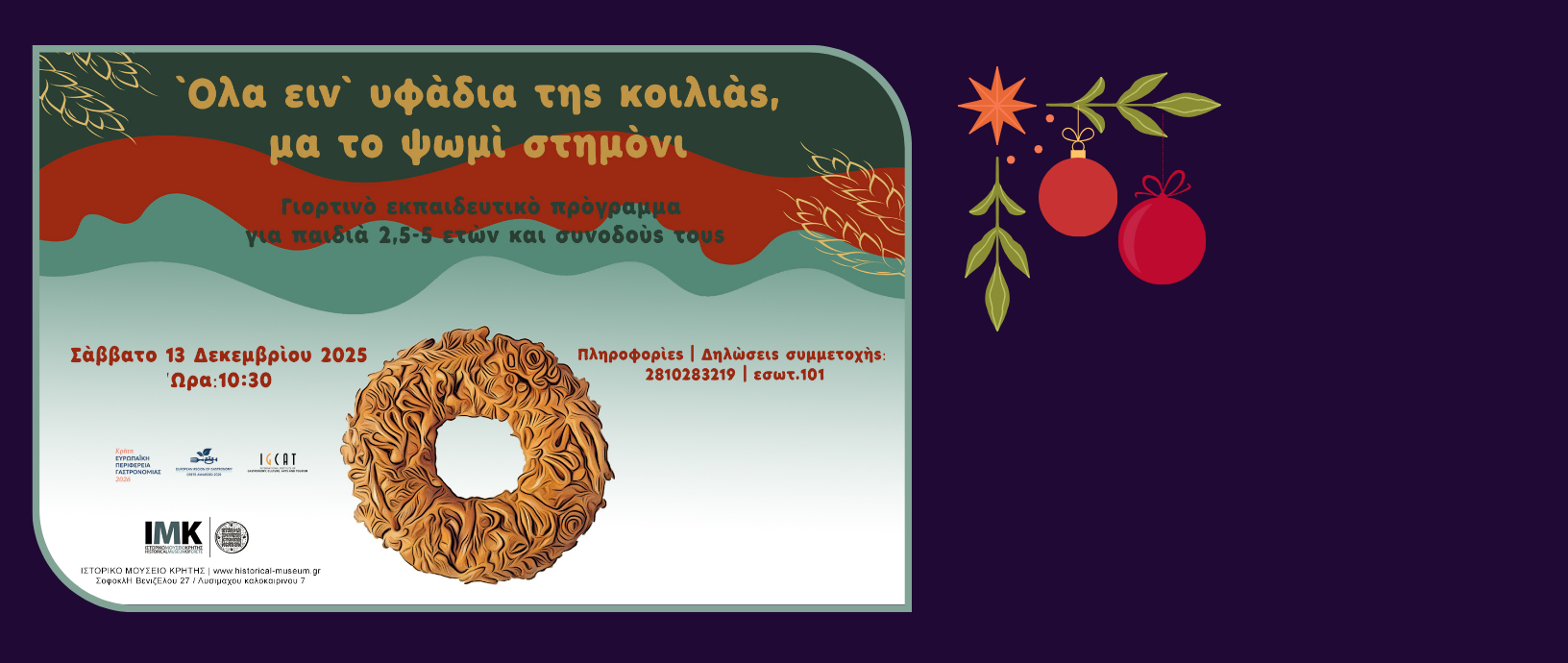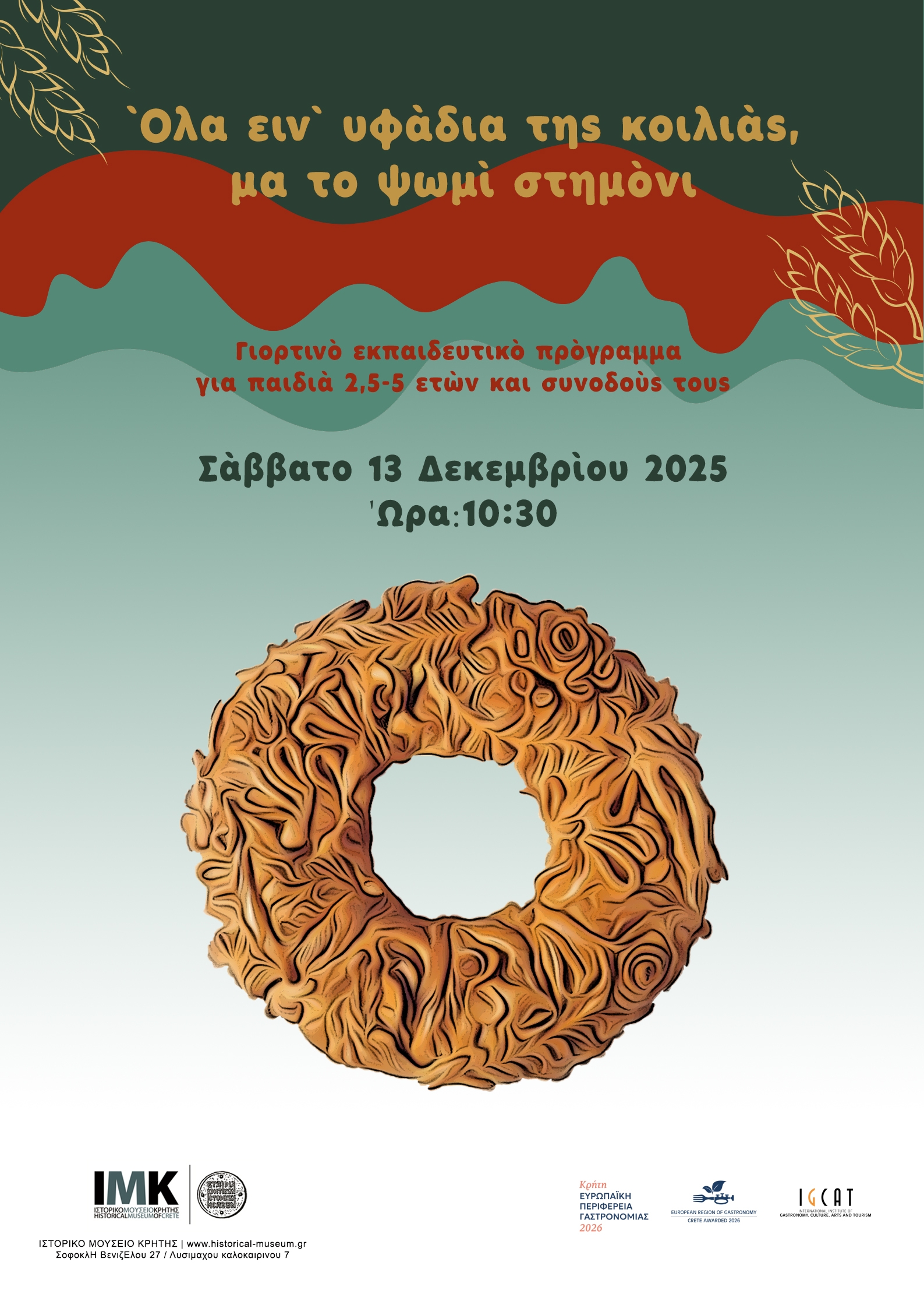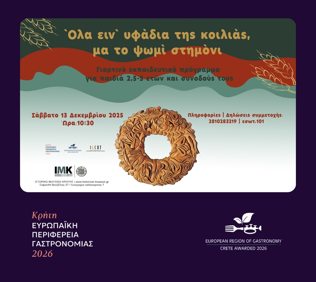 Το Σάββατο 13 Δεκεμβρίου 2025 προετοιμαζόμαστε για τις γιορτινές μέρες με οδηγό μας τις ζύμες, τα τσουρέκια και άλλα γιορτινά αρτοσκευάσματα από την ιστορία του Ηρακλείου. Το Τμήμα Εκπαιδευτικών Προγραμμάτων του Ιστορικού Μουσείου Κρήτης προσκαλεί τα παιδιά σε μια βόλτα εξερεύνησης μέσα στο Μουσείο, ακολουθώντας τη μυρωδιά του ψωμιού. Θα γνωρίσουμε τη διαδικασία παραγωγής και κατανάλωσης, τις παραδόσεις, τις δεισιδαιμονίες και τις τέχνες που συνδέονται με το σημαντικό αυτό υλικό της διατροφικής μας πυραμίδας. Θα πούμε το ψωμί ψωμάκι ή θα φάμε μαζί ψωμί κι αλάτι;