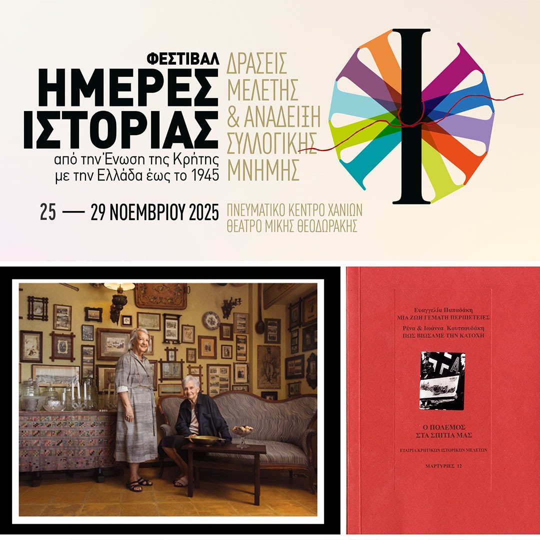 Στο πλαίσιο του φετινού θεματικού κύκλου «Αφηγηματικές Όψεις της Ιστορίας», το Φεστιβάλ Ημέρες Ιστορίας (Χανιά, 25-29 Νοεμβρίου 2025) εντάσσει στο πρόγραμμά του τη σειρά «Μαρτυρίες» της Εταιρίας Κρητικών Ιστορικών Μελετών, μια πολύτιμη συλλογή αφηγήσεων για τη Μάχη της Κρήτης και την περίοδο της Κατοχής.