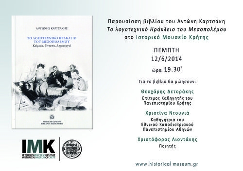 Με οδηγό τη λογοτεχνία της περιόδου και μέσα από τα κείμενα των περιοδικών αναζητούνται απαντήσεις στα ερωτήματα αυτά και επιχειρείται η «χαρτογράφηση» της πνευματικής ζωής του μεσοπολεμικού Ηρακλείου, πτυχές της οποίας θα αναδειχθούν κατά την παρουσίαση του βιβλίου του Αντώνη Καρτσάκη Το λογοτεχνικό Ηράκλειο του Μεσοπολέμου. Κείμενα, Έντυπα, Δημιουργοί, Δήμος Ηρακλείου - Βικελαία Δημοτική Βιβλιοθήκη Ηρακλείου, 2013 που οργανώνεται από την Εταιρία Κρητικών Ιστορικών Μελετών την Πέμπτη 12 Ιουνίου 2014, ώρα 19.30΄, στο Ιστορικό Μουσείο Κρήτης.