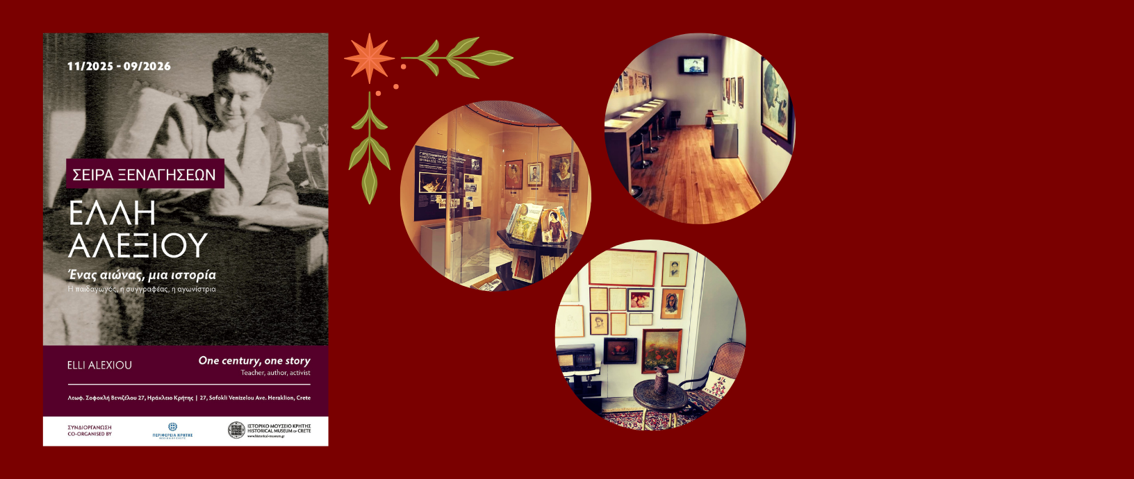 Το Ιστορικό Μουσείο Κρήτης οργανώνει σειρά ξεναγήσεων στη νέα περιοδική έκθεση «Έλλη Αλεξίου. Ένας αιώνας, μια ιστορία. Η παιδαγωγός, η συγγραφέας, η αγωνίστρια», με την κύρια επιμελήτρια της έκθεσης, Ειρήνη Φουκαράκη.