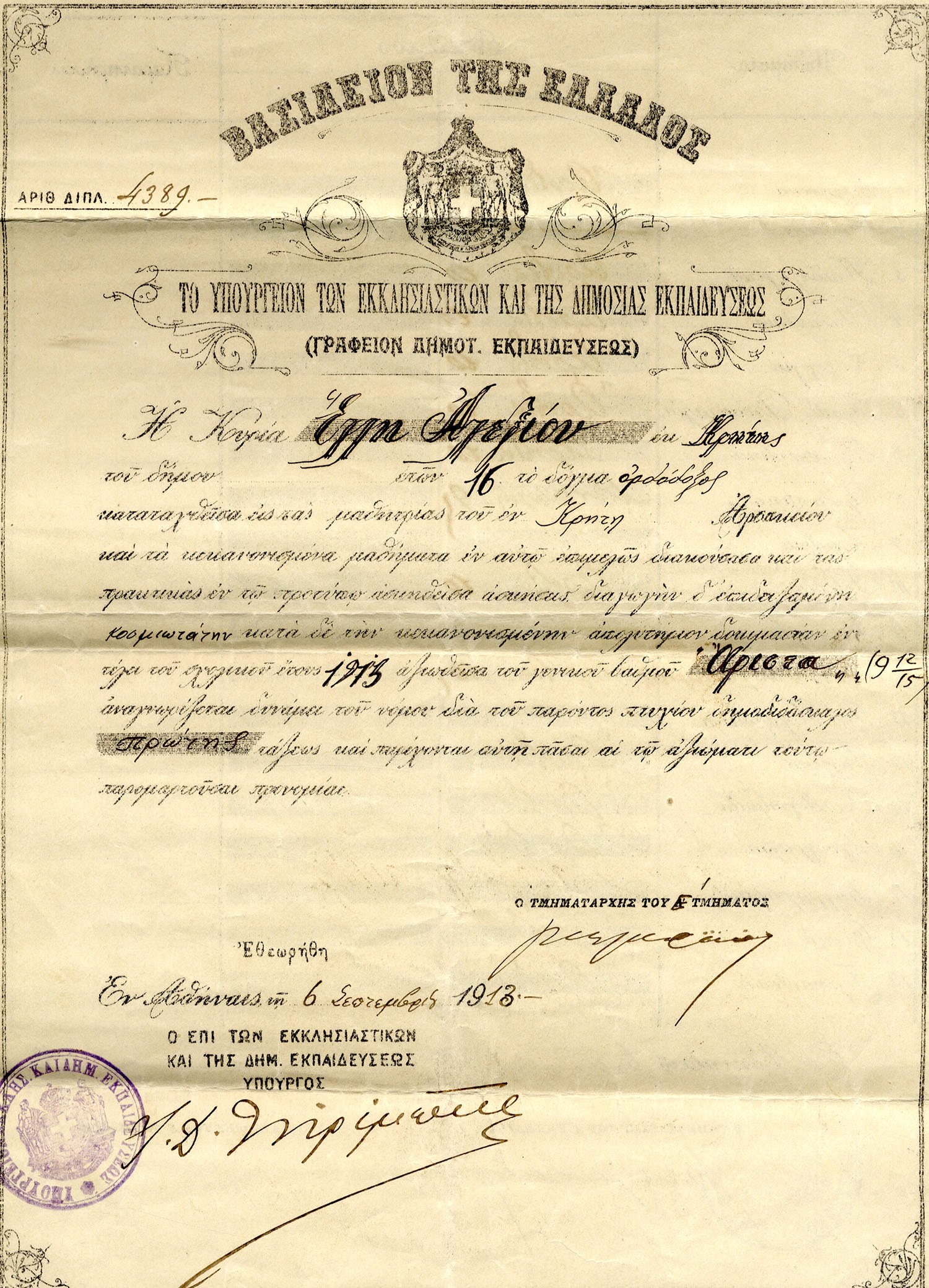 Το πτυχίο της από το Αρσάκειο όπου αναγνωρίζεται ως δημοδιδάσκαλος Α΄ Τάξεως, 6 Σεπτεμβρίου 1913