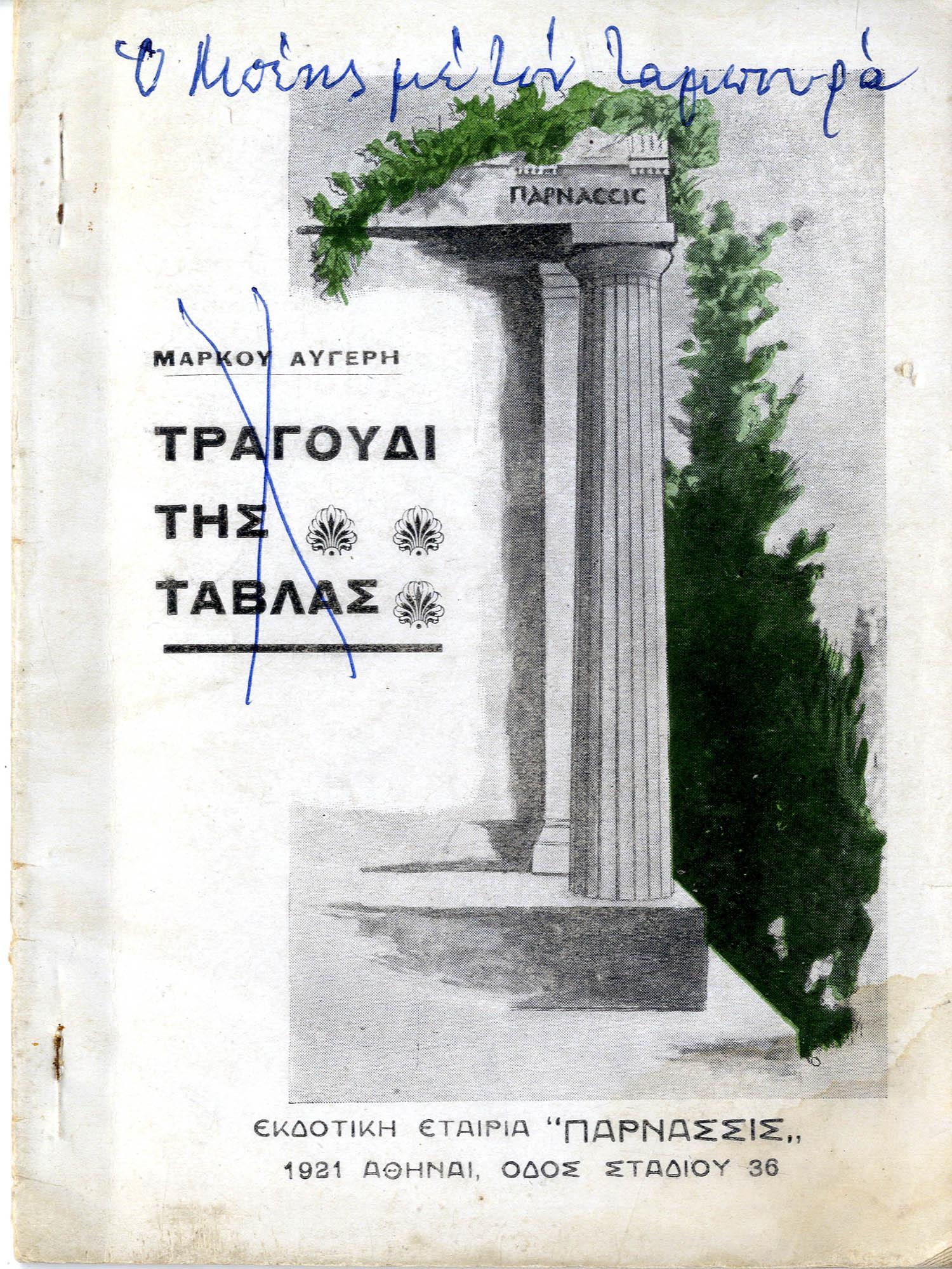 Το έργο του Μάρκου Αυγέρη "Το τραγούδι της τάβλας" με χειρόγραφες σημειώσεις.