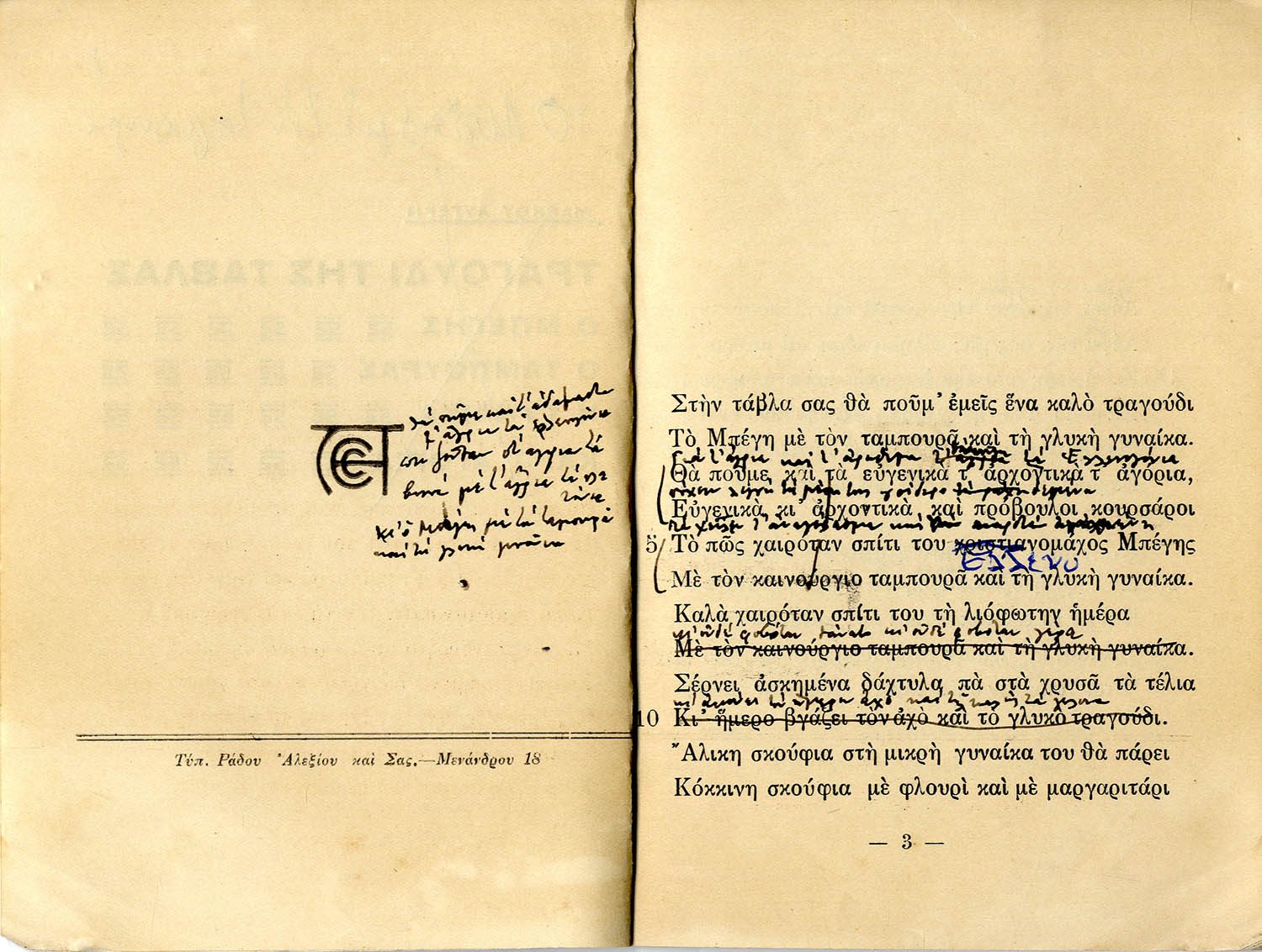 Το έργο του Μάρκου Αυγέρη Το τραγούδι της τάβλας, Αθήνα 1921 (με χειρόγραφες σημειώσεις)