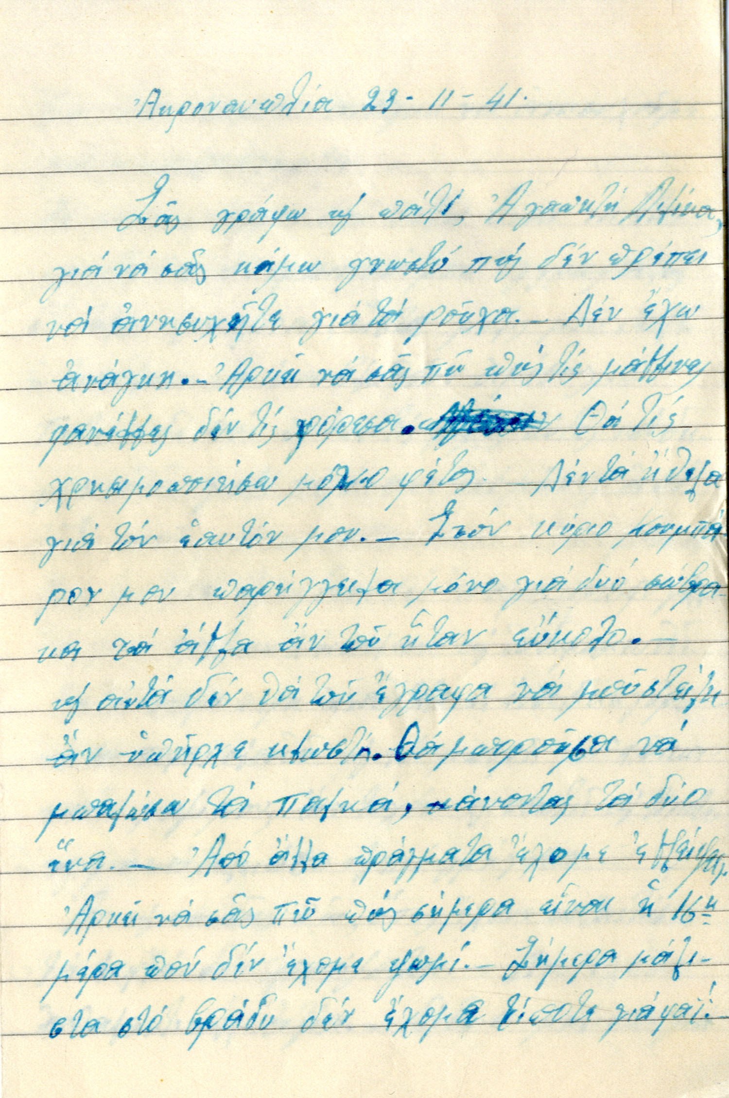 Σας γράφω και πάλι, Αγαπητή Λιλίκα, για να σας κάνω γνωστό πως δεν πρέπει να ανησυχείτε για τα ρούχα.- Δεν έχω ανάγκη. […] Από άλλα πράγματα έχομε ελλείψεις. Αρκεί να σας πω σήμερα είναι η 16η μέρα που δεν έχομε ψωμί. Σήμερα μάλιστα στο βράδυ δεν έχομε τίποτε για φαΐ. Δεν είναι λοιπόν ανάγκη να ανησυχούμε για μικροπράγματα. […]