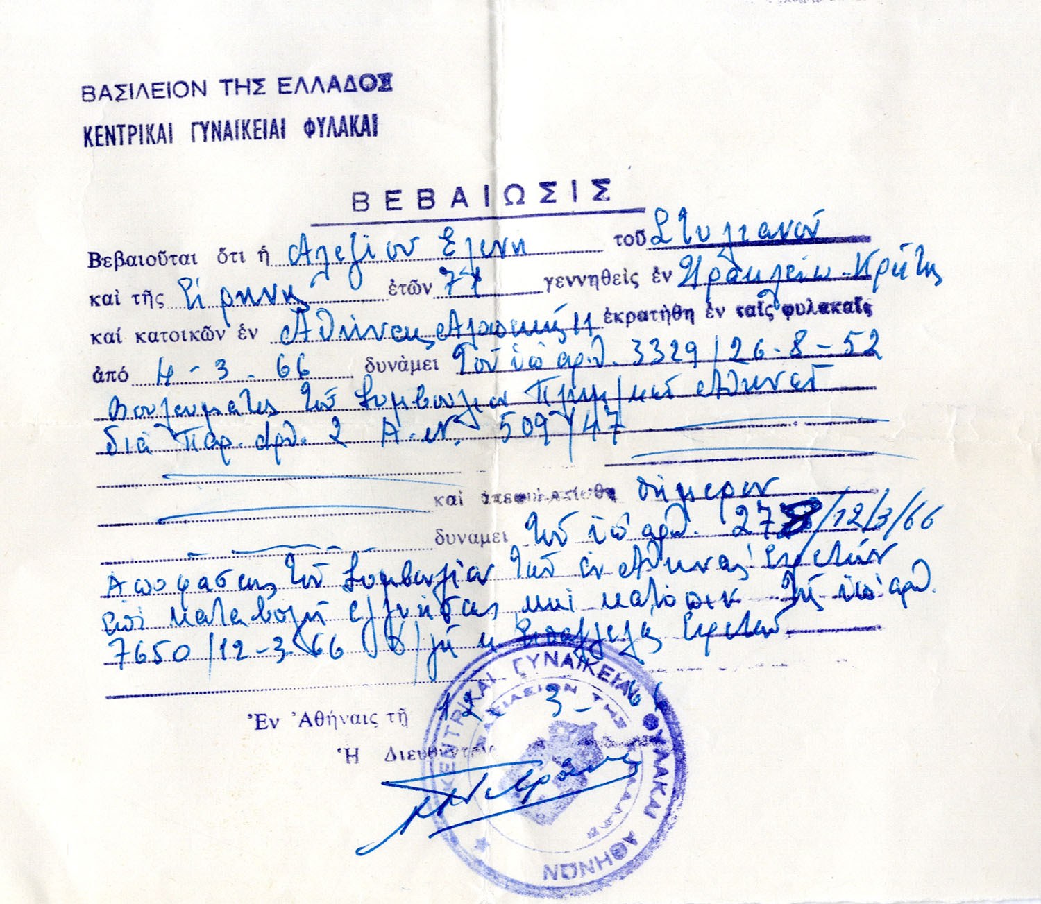 Η βεβαίωση κράτησης της Έλλης Αλεξίου στις γυναικείες φυλακές Αθηνών το 1966