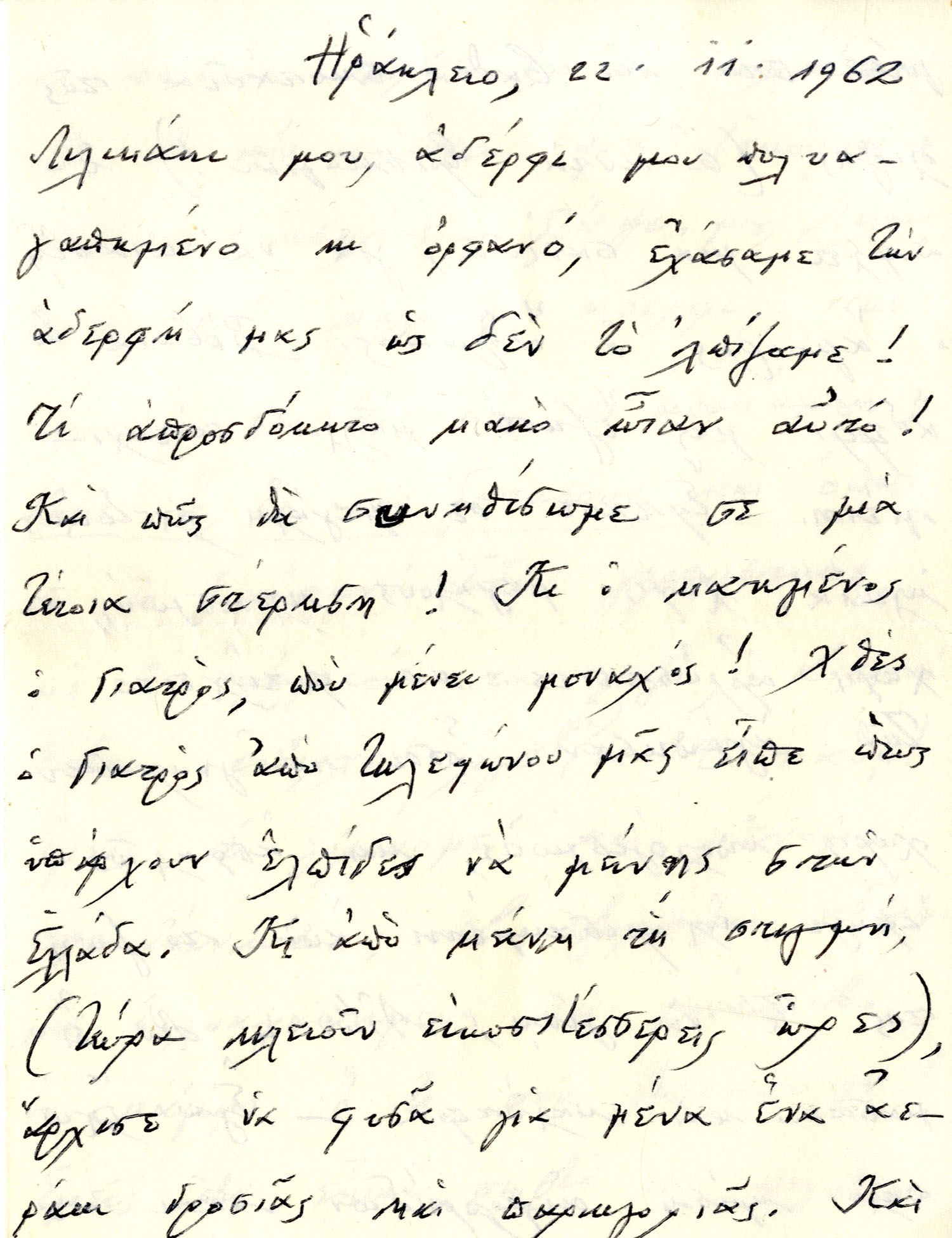 Λιλικάκι μου, αδέρφι μου πολυαγαπημένο κι ορφανό, εχάσαμε την αδερφή μας ως δεν το' λπίζαμε! Τί απροσδόκητο κακό ήταν αυτό! Και πως θα συνηθίσωμε σε μια τέτοια στέρηση! Κι ο καημένος ὁ Γιατρός, πού μένει μοναχός! Χθες ο Γιατρός από τηλεφώνου μας είπε πώς υπάρχουν ελπίδες να μένεις στην Ελλάδα. Κι από κείνη τη στιγμή, (τώρα κλειούν εικοσιτέσσερεις ώρες), άρχισε να φυσά για μένα ένα αεράκι δροσιάς και παρηγοριάς. Και μέσα στα βαθιά σκοτάδια της θλίψης (σ’ αυτά βρίσκομαι!) υπάρχει μια σανίδα για να πιαστεί ο άμοιρος άνθρωπος. Βέβαια το αδέρφι μας έζησε μάλλον ευτυχισμένη. Έφτασε σε μεγάλη σχετικά ηλικία, χωρίς μεγάλους κλονισμούς, χωρίς αρρώστιες και φτώχειες. Την αγάπησαν όσοι τη γνώρισαν, χωρίς υπολογισμούς, και ασφαλώς έφυγε ευχαριστημένη από τη ζωή της. Τι να γίνει; Αιώνιοι δεν είμαστε…και καλύτερα. […] Γράψε μου Λιλίκα, καλό μου αδέρφι την προοπτική σου. Τι θα σε αποκάμουν; Κάμε ό,τι σου ζητήσουν και όπως σου το ζητήσουν! Σ’ εξορκίζω, αδέρφι μου πολυαγαπημένο και μονάκριβο να κάμης ό,τι σου ζητήσουν. Ημείς δεν είναι σωστό να πολιτευόμαστε. Είμαστε πάνω από την πολιτική. […] Περιμένω γράμμα σου να μου τονώσει τις ελπίδες μου. Αν μείνεις οριστικά, θα ζήσωμε μαζί ή εδώ ή εκεί. Μην καθυστερήσεις την απάντησή σου.