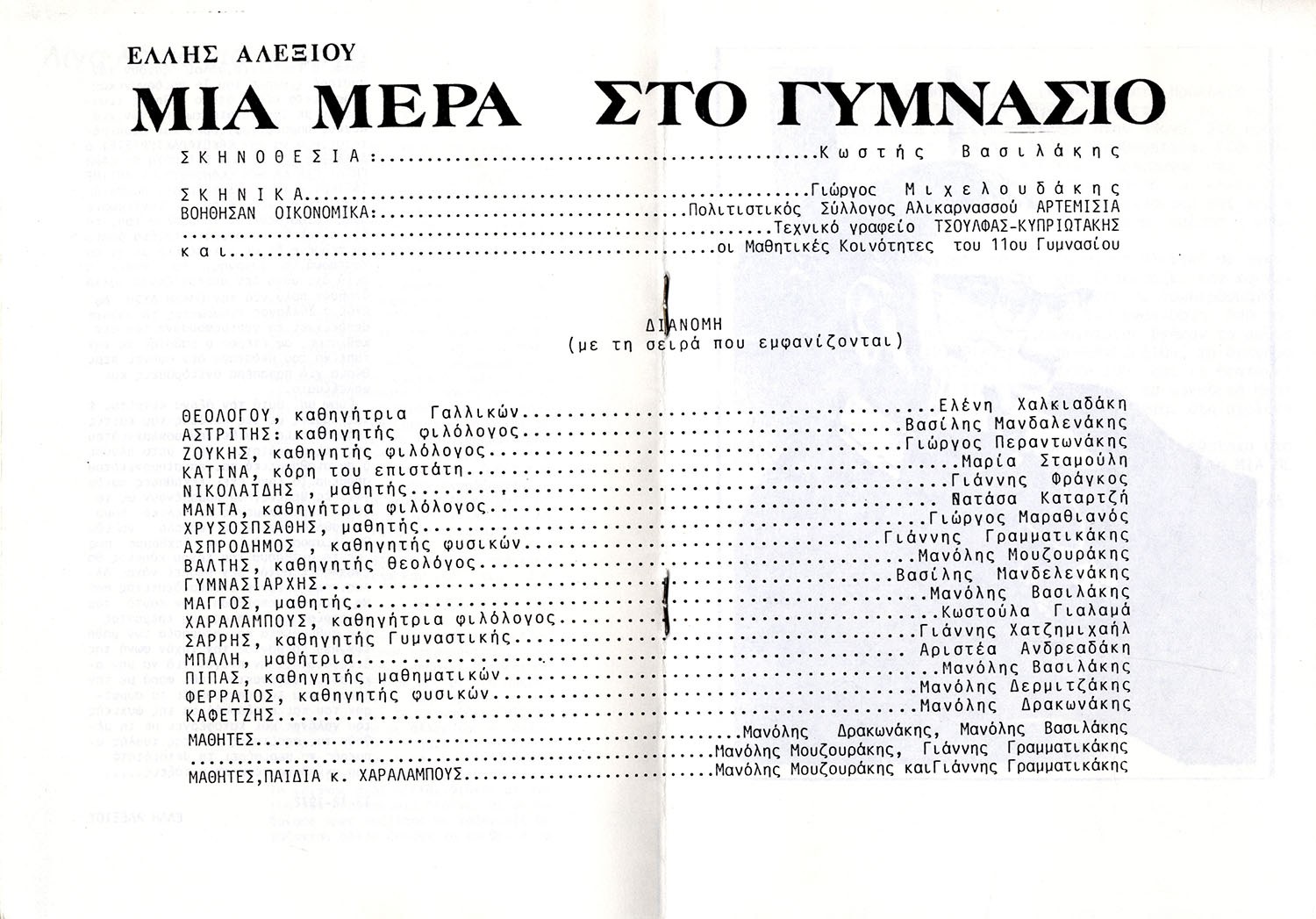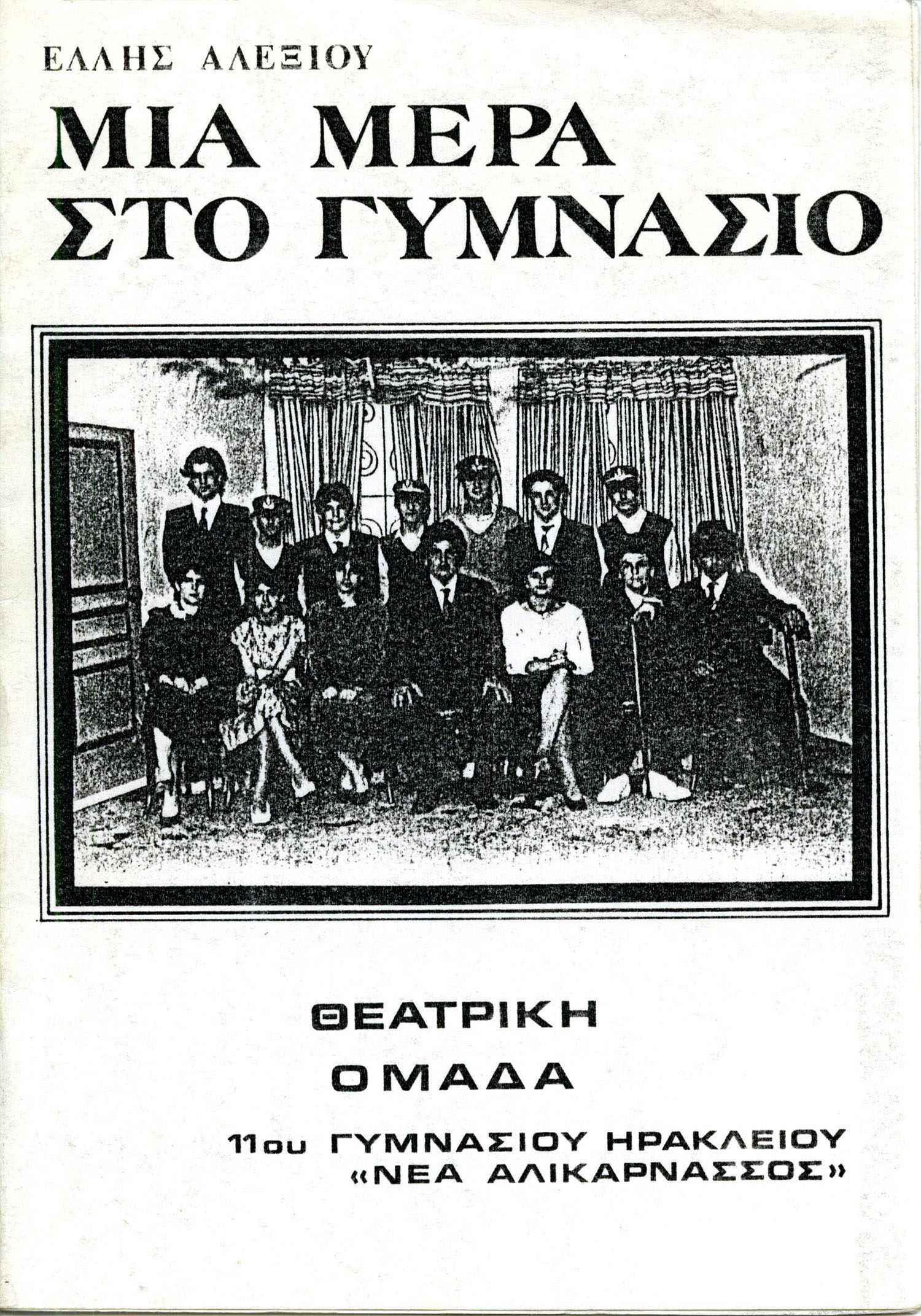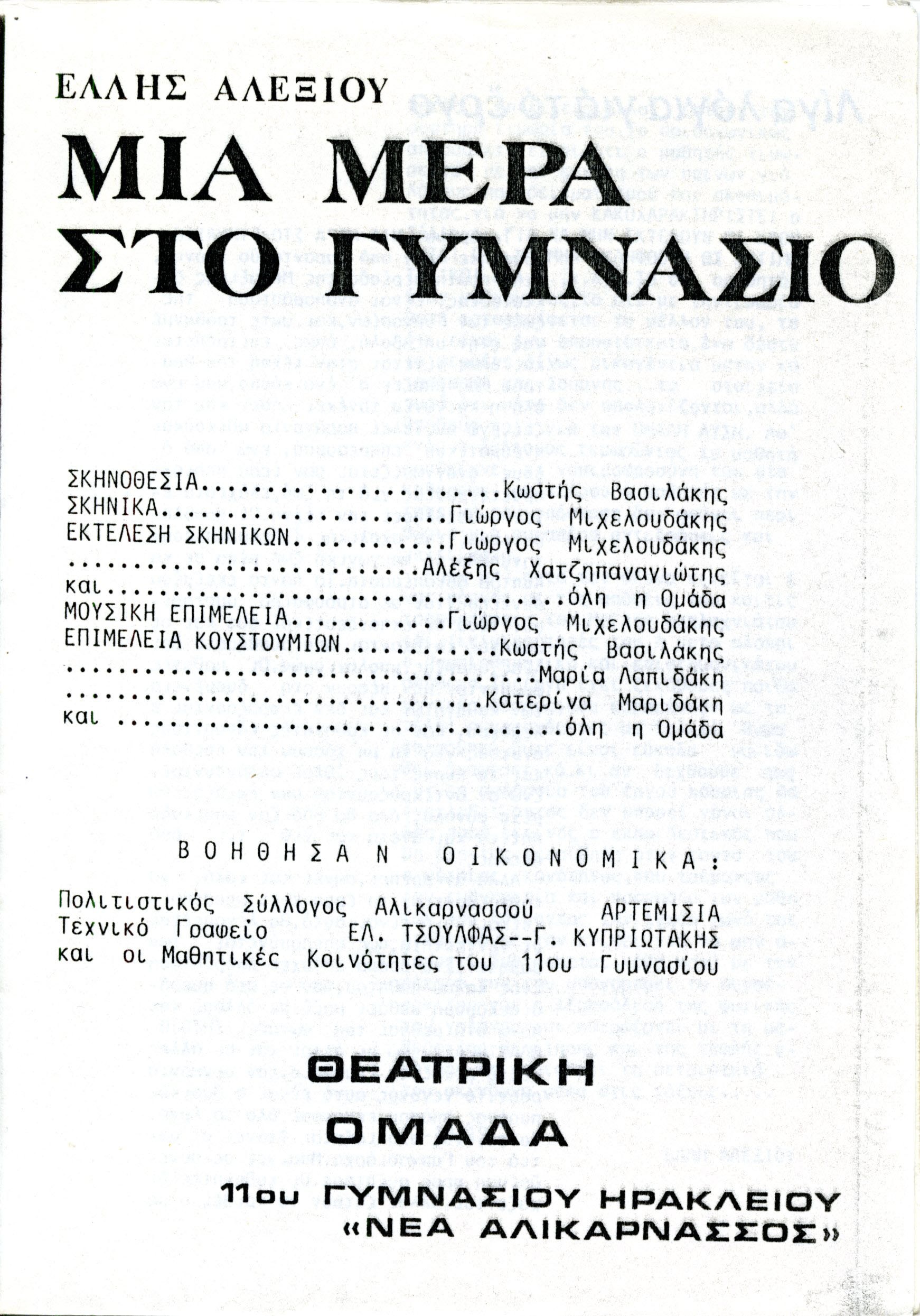 Το πρόγραμμα της μαθητικής παράστασης του έργου της Έλλης Αλεξίου Μια Μέρα στο Γυμνάσιο από το 11ο Γυμνάσιο Ηρακλείου