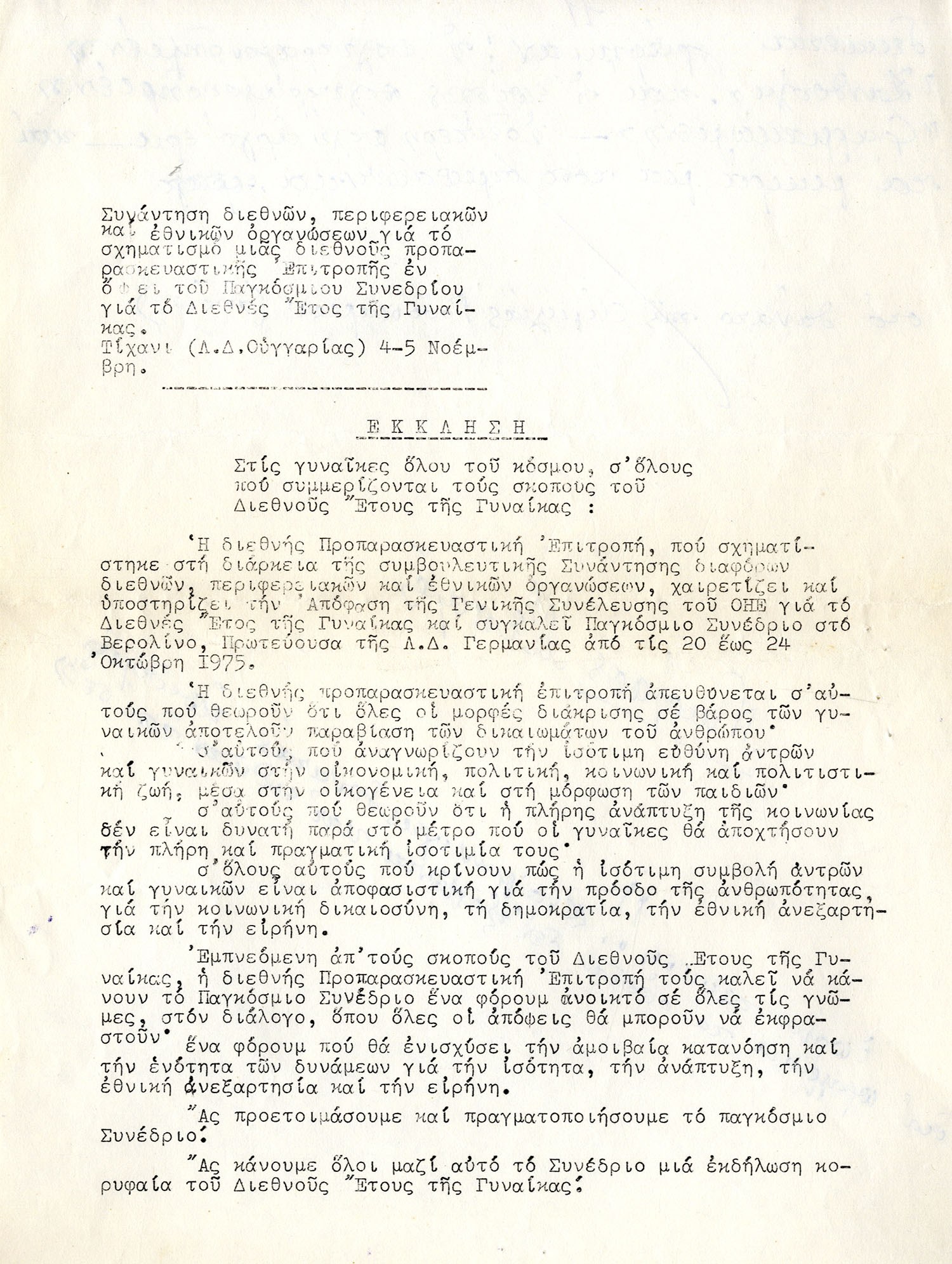 Πρόσκληση για σχηματισμό Επιτροπής Εκπροσώπησης στο Παγκόσμιο Συνέδριο για το Διεθνές Έτος της Γυναίκας, 4-5 Νοεμβρίου 1974