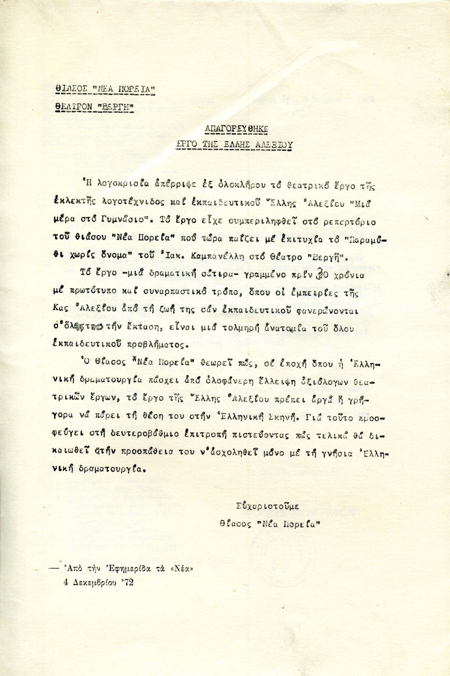 Ανακοίνωση του Θεάτρου Βέργη για την απαγόρευση να ανέβει το έργο Μια μέρα στο Γυμνάσιο στο θέατρο, 4 Δεκεμβρίου 1972