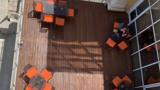Το ΙΜΚ Café, βρίσκεται στο 1ο επίπεδο του κτιρίου σε ένα στεγασμένο και δύο υπαίθριους χώρους, το βορινό deck που βλέπει στη θάλασσα και τη νοτική αυλή στη σκιά των ψηλών δέντρων της πρόσοψης του νεοκλασικού κτιρίου. Διαθέτει καφέ, ροφήματα, αναψυκτικά, χυμούς και φαγητό.